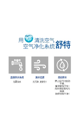 用 H O 清洗空气 2 空气净化系统 舒特 直接供水系统 清水过滤 自动排水 无需加水 无污染 更安全! 停止运行时自动 , 干燥 , 管理更加卫生! 向外排放室内污 染源 , 始终保持干净!
